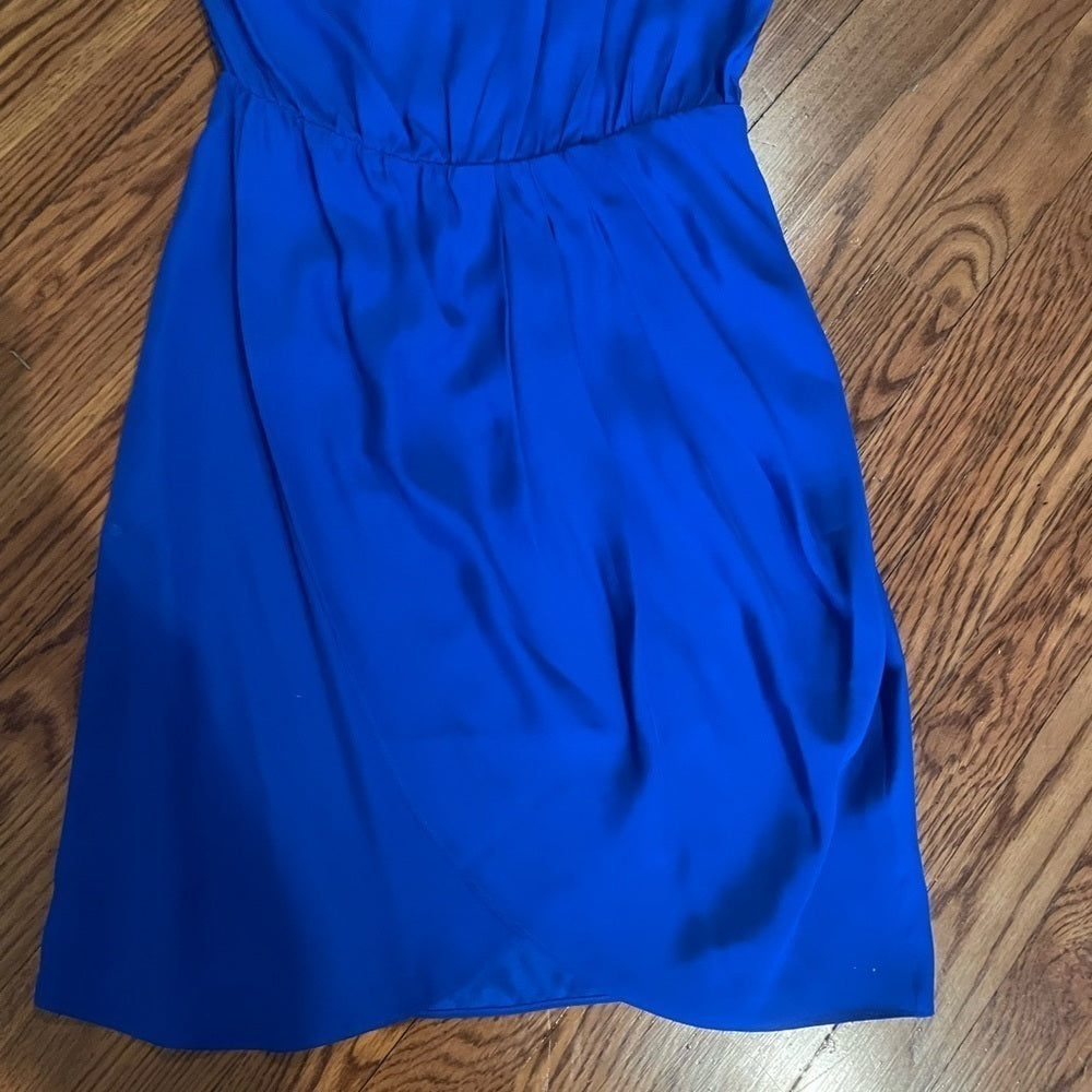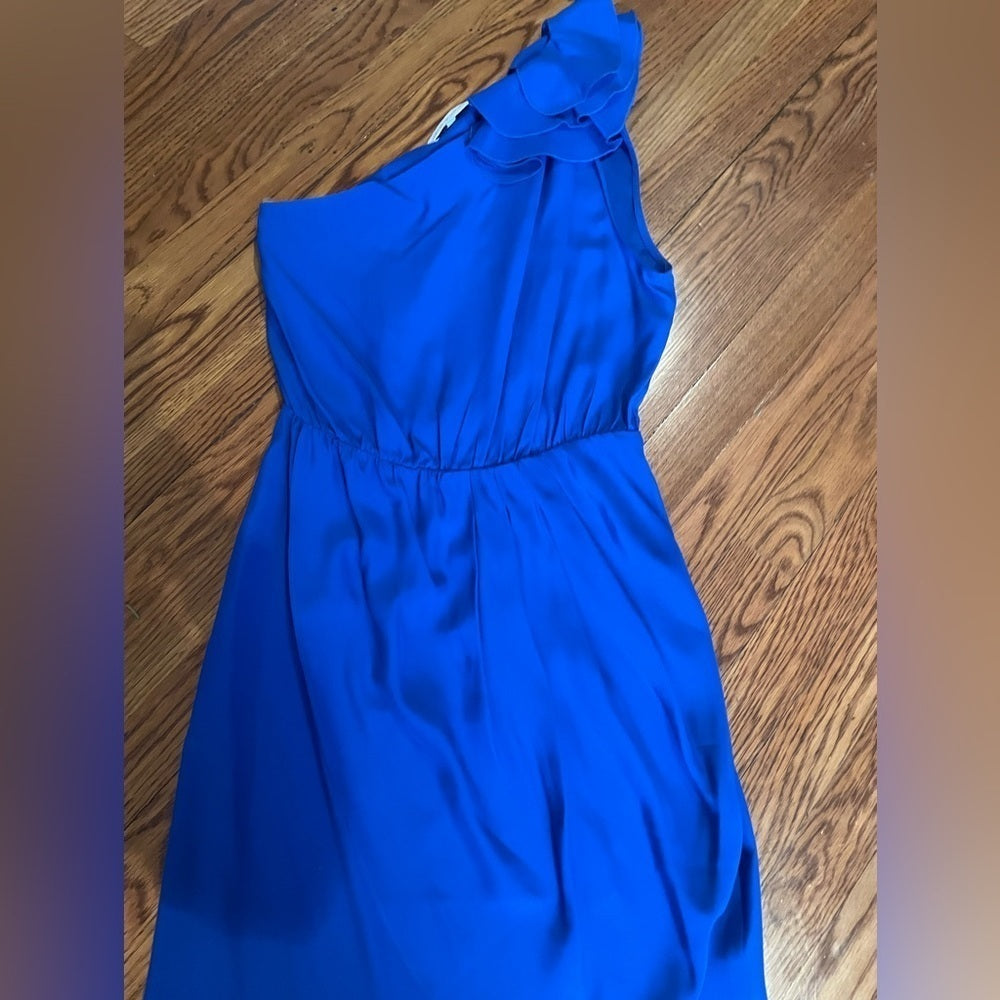 In amazing condition, vibrant blue dress with off the shoulder one sleeve.