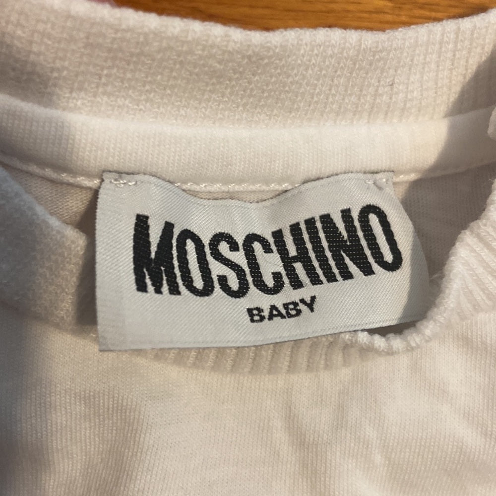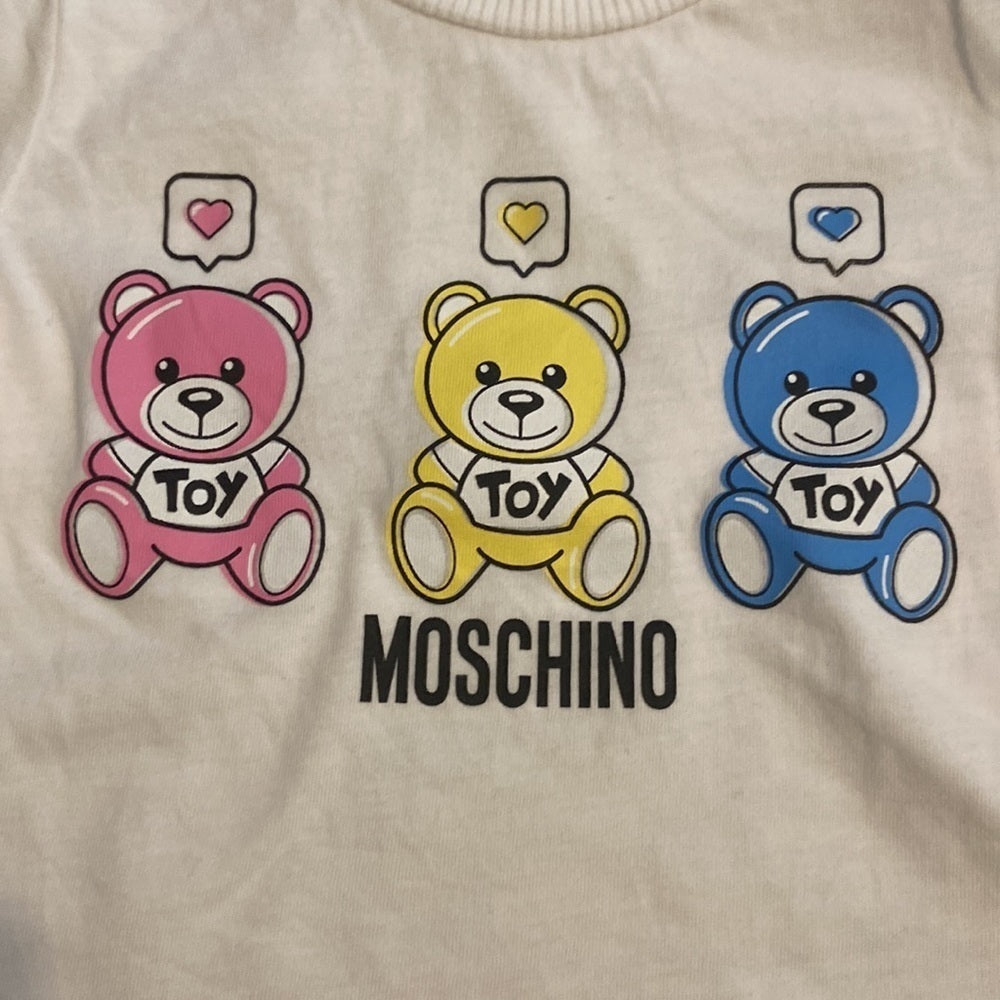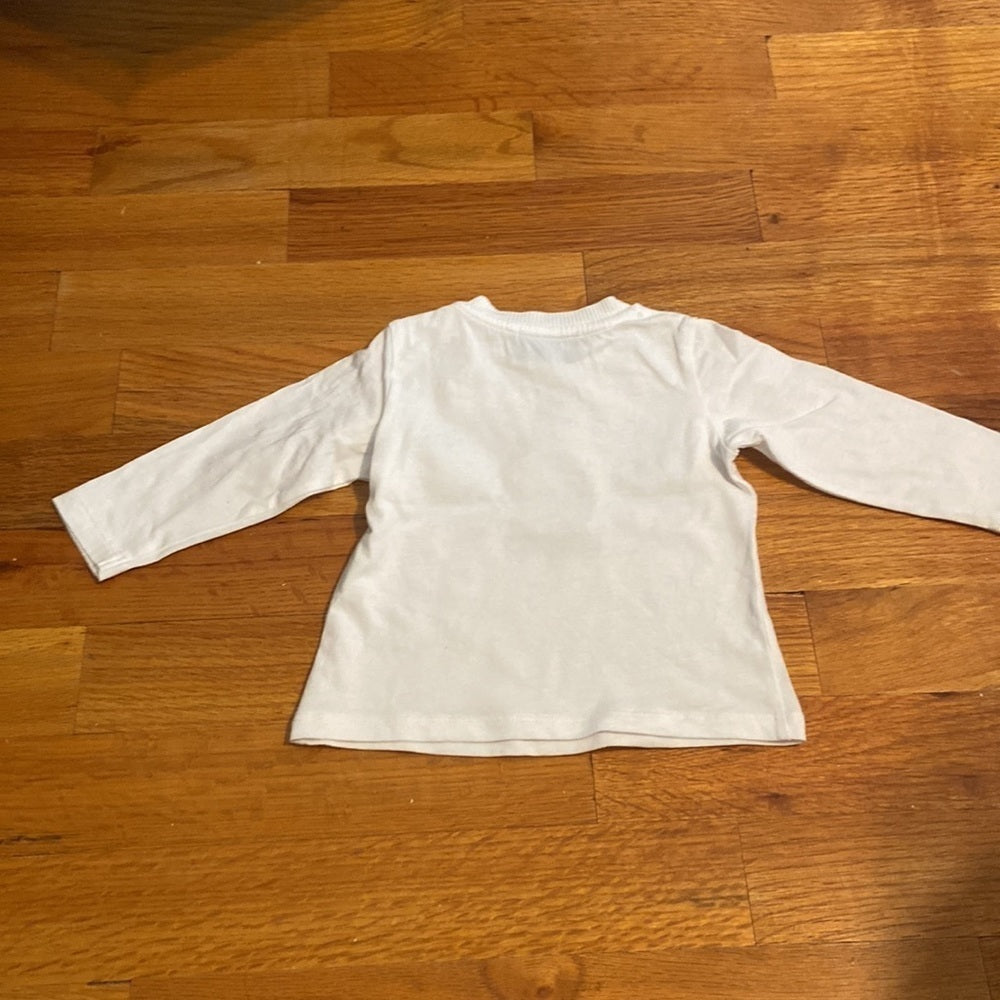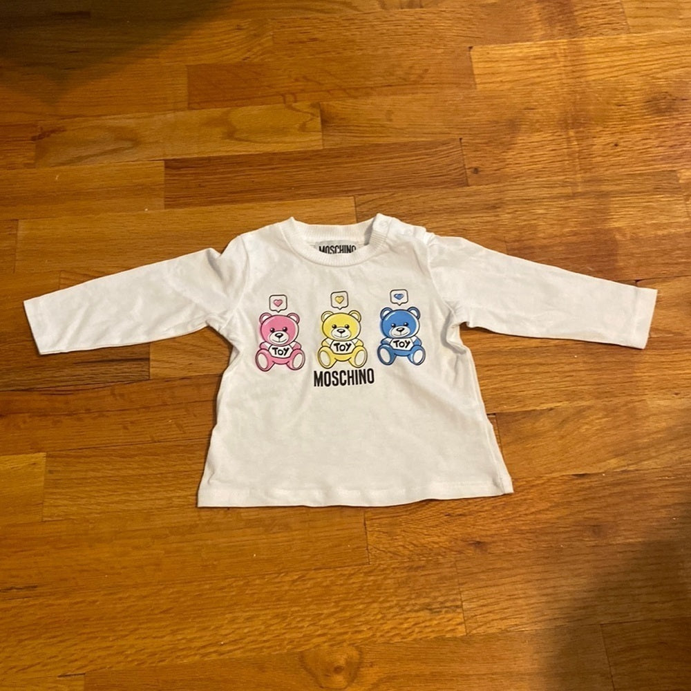White long sleeved shirt with button closure on shoulder. Three bear design