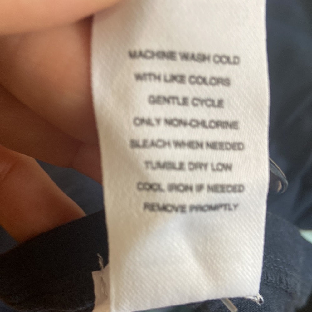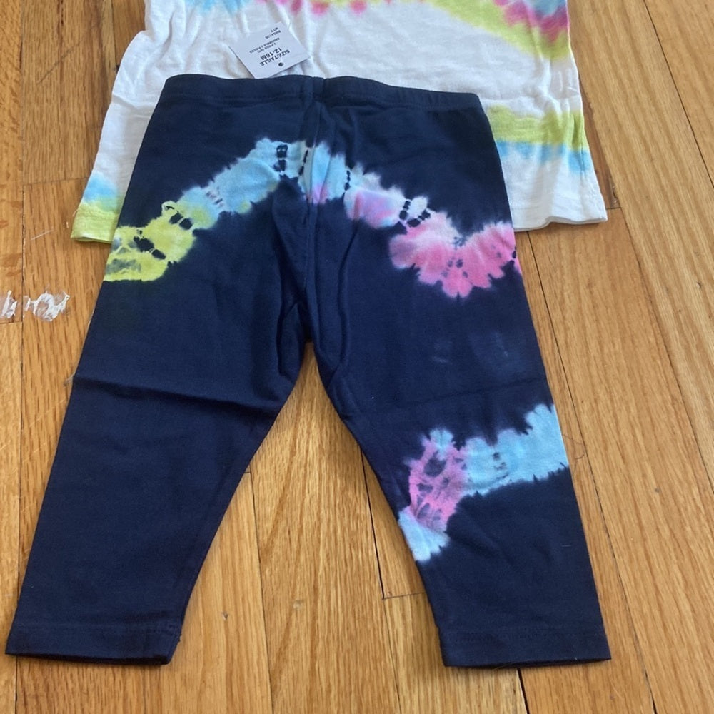 Tye dye outfit. White with green/pink/blue tye dye design. Two buttons on back. Navy blue pants with pink/blue/green tye dye design