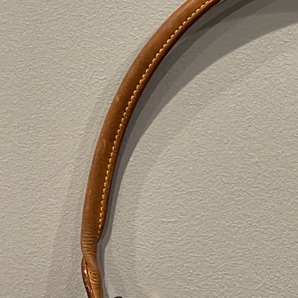 In good condition, the handle has a little wear and tear. Inside has some stains on the fabric, but otherwise in good condition! Zipper closure.