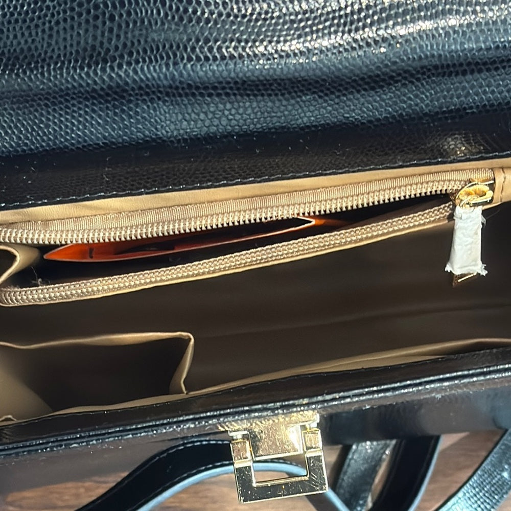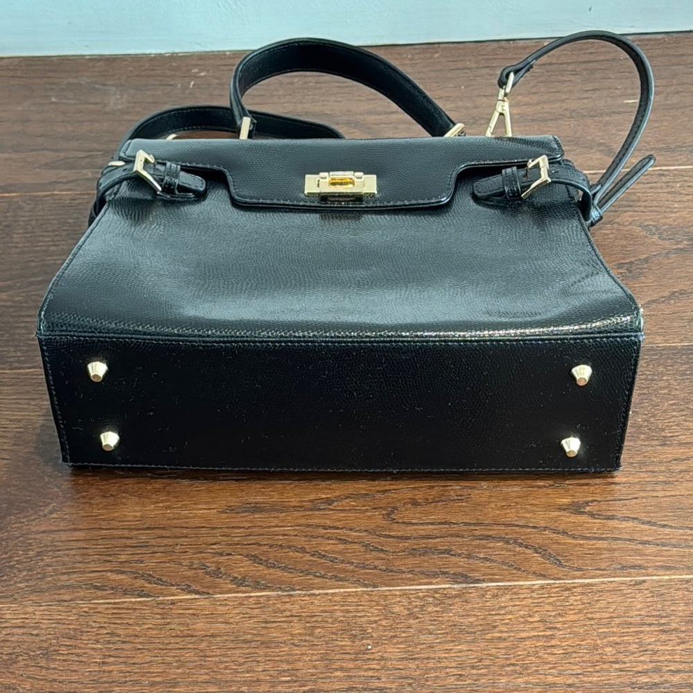 Chic black leather handbag with gold-tone hardware. Features a top handle and secure clasp closure. Perfect for any occasion. Brand new condition