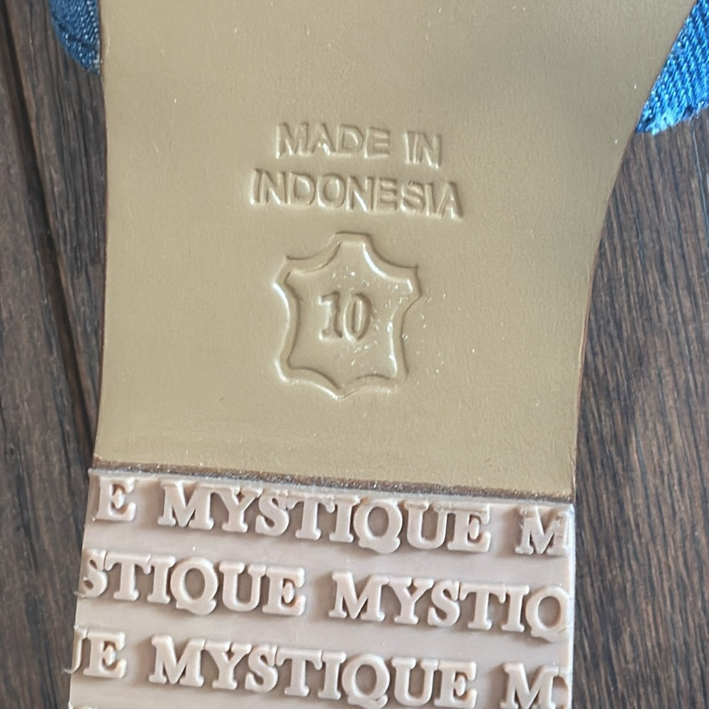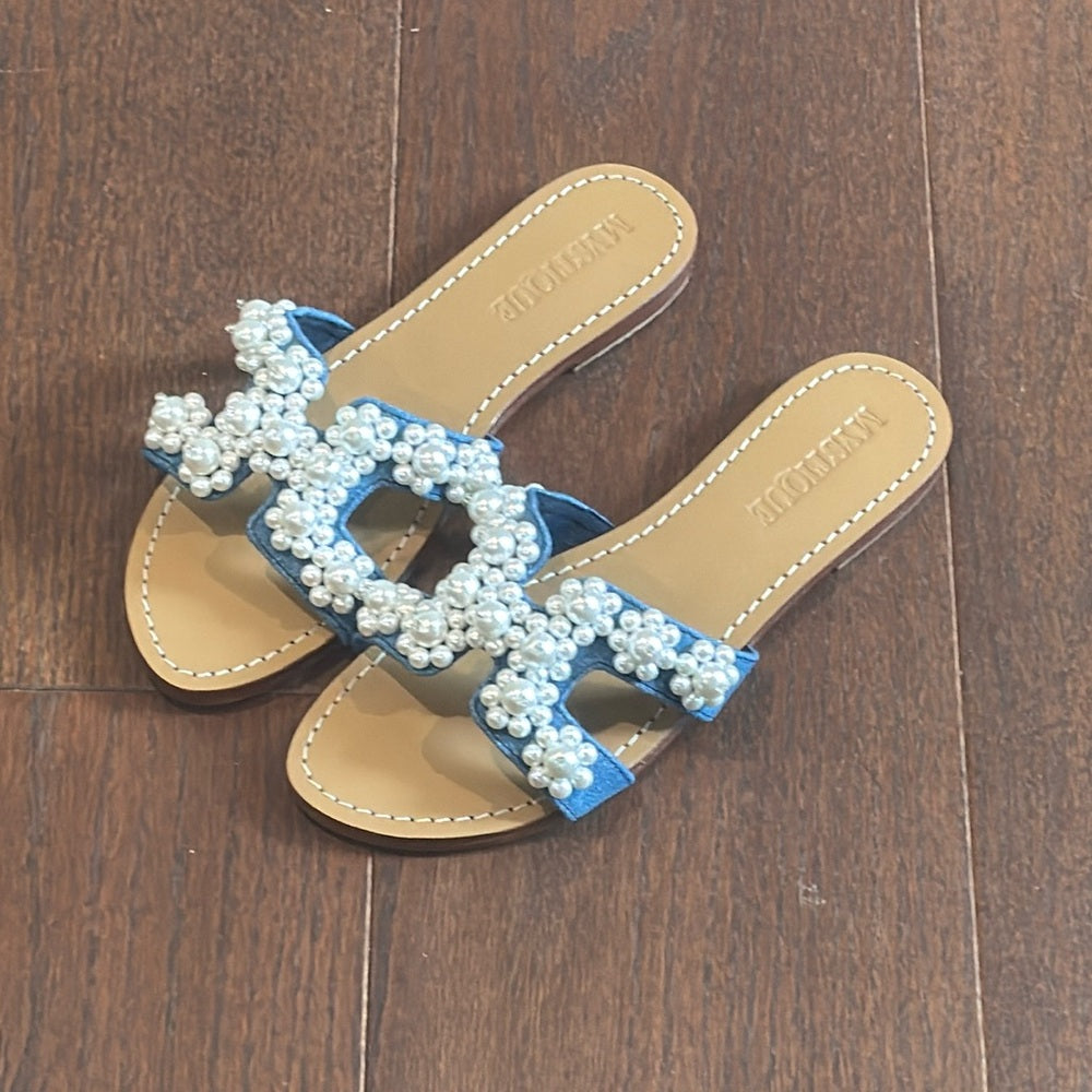 NWOT Mystique Women’s Denim and Pearls Flat Sandals Size 10