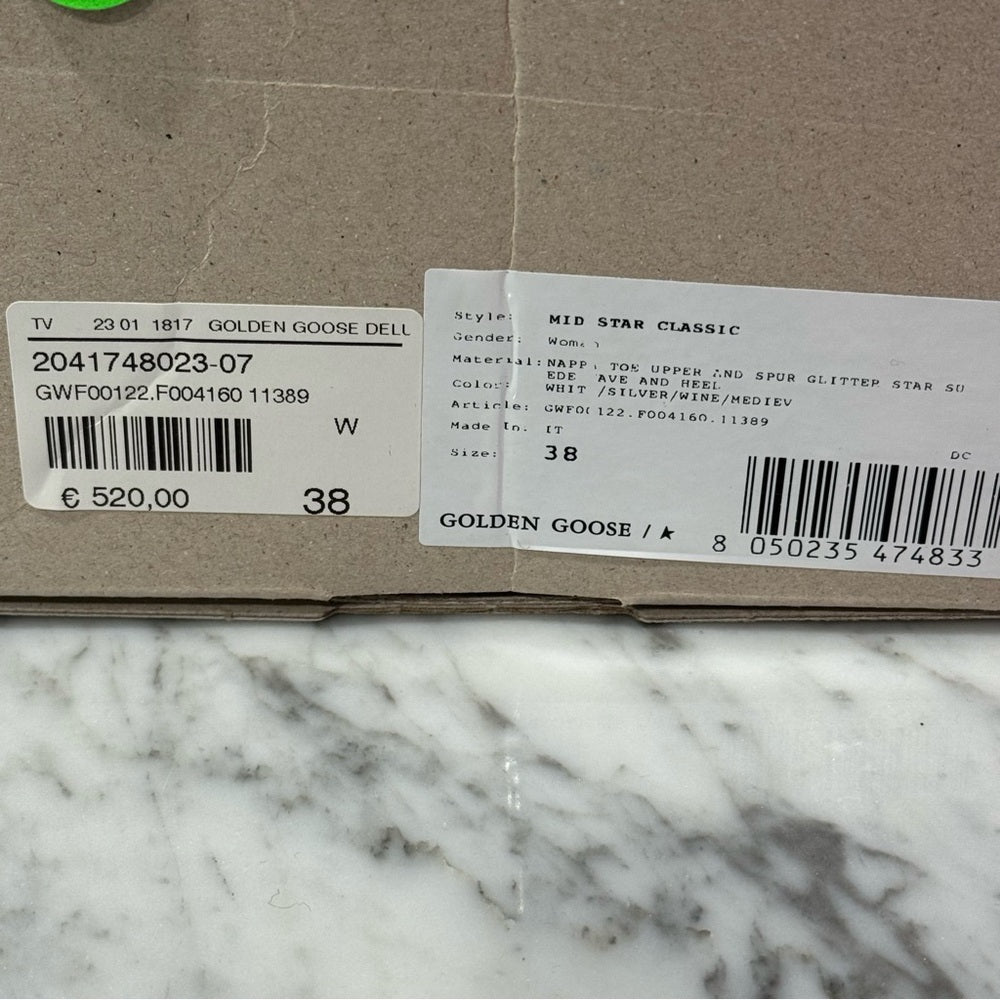NWT Golden Goose MidStar Classic Sneakers Glitter Silver, White & Wine Size 38/8