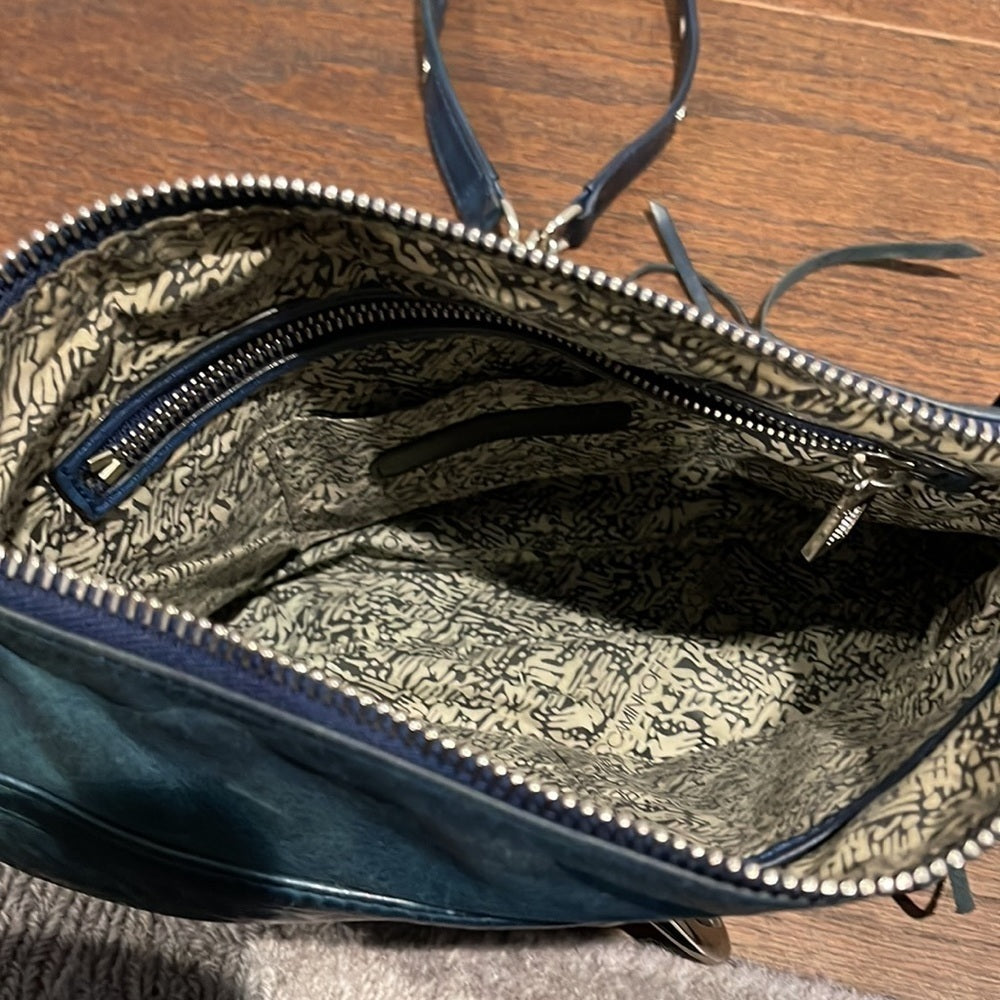 In worn condition, but still in good condition. Blue distressed leather. Zipper closure and zipper pocket Inside. Silver hardware.