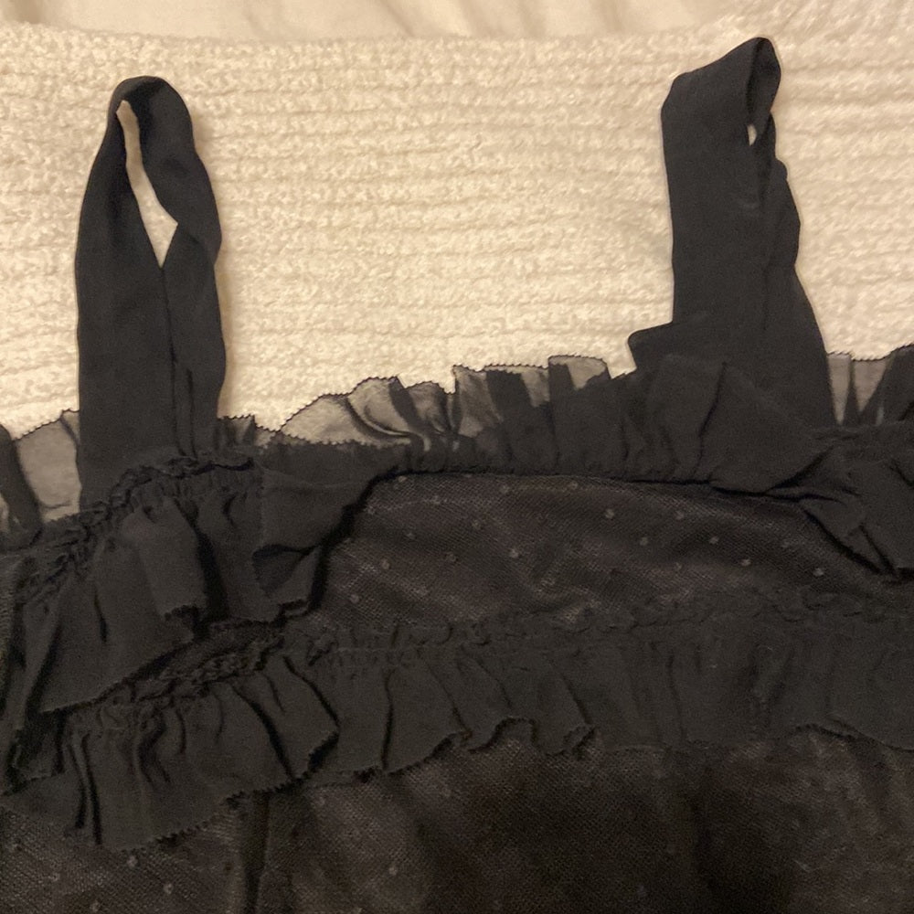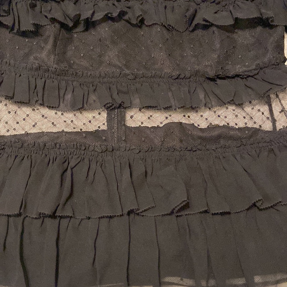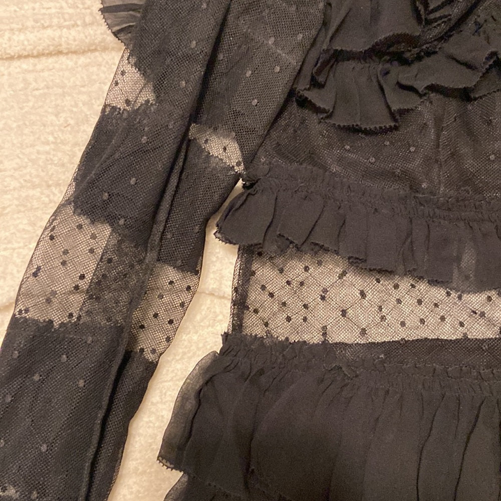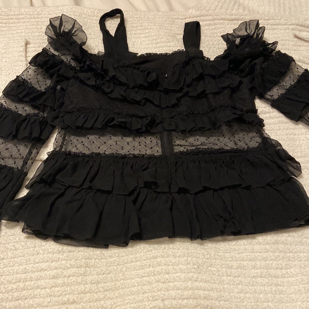 Cold shoulder black top. Ruffles with sheer panels. Zipper on back.