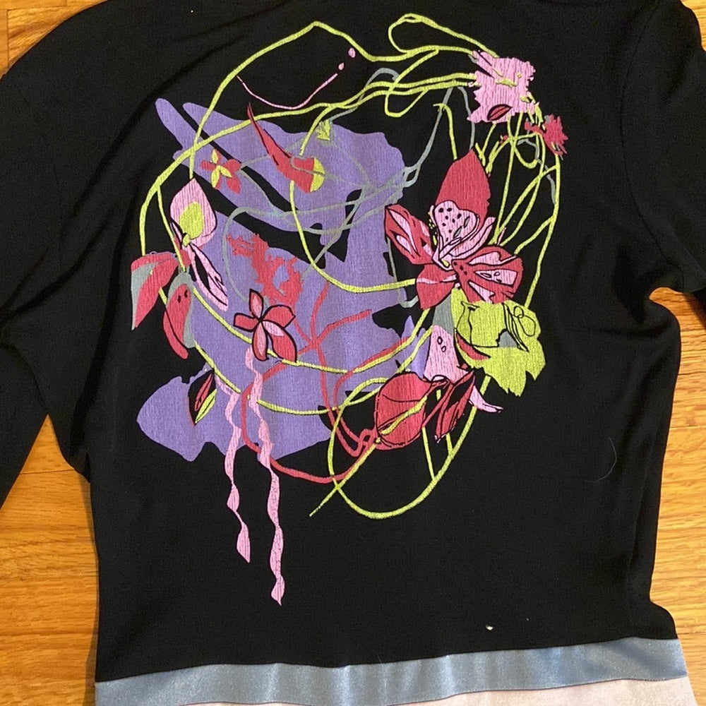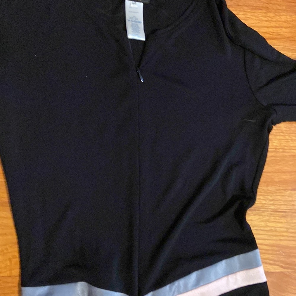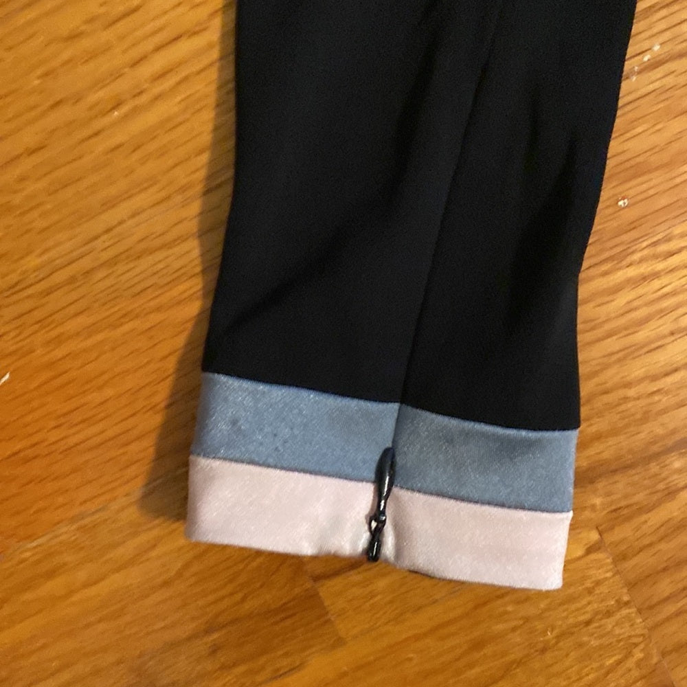 Long black dress with pink and grey stripe. Zippered sleeve and zippered in front. Design on back