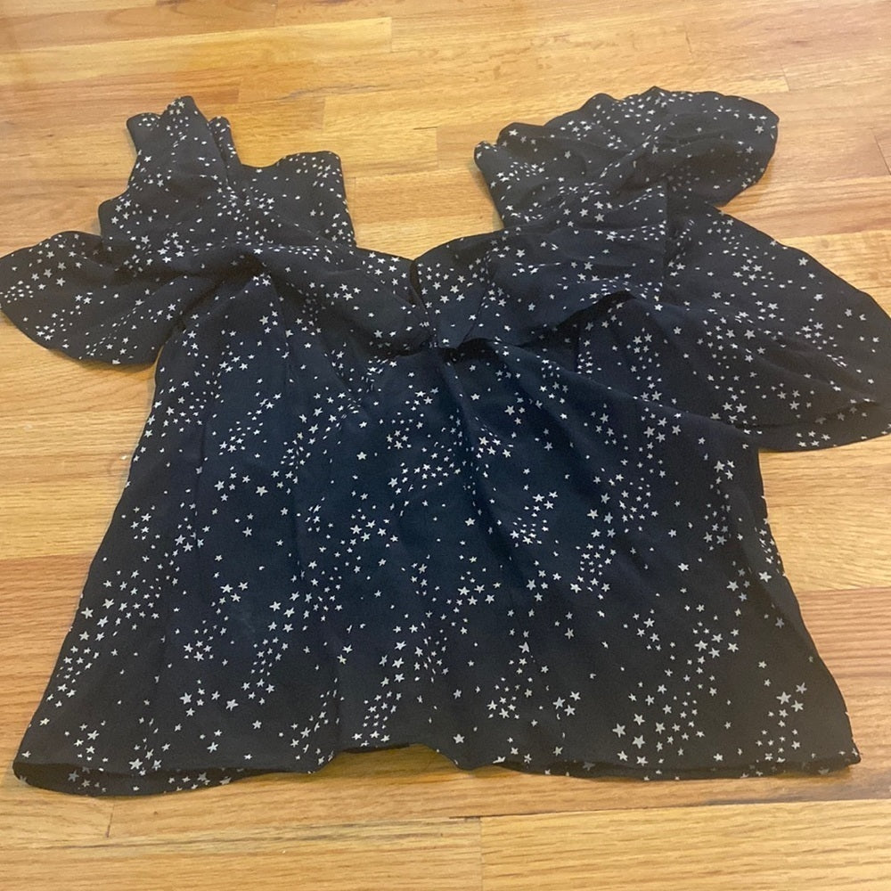 Black cold shoulder top with ruffles. Gold star design.