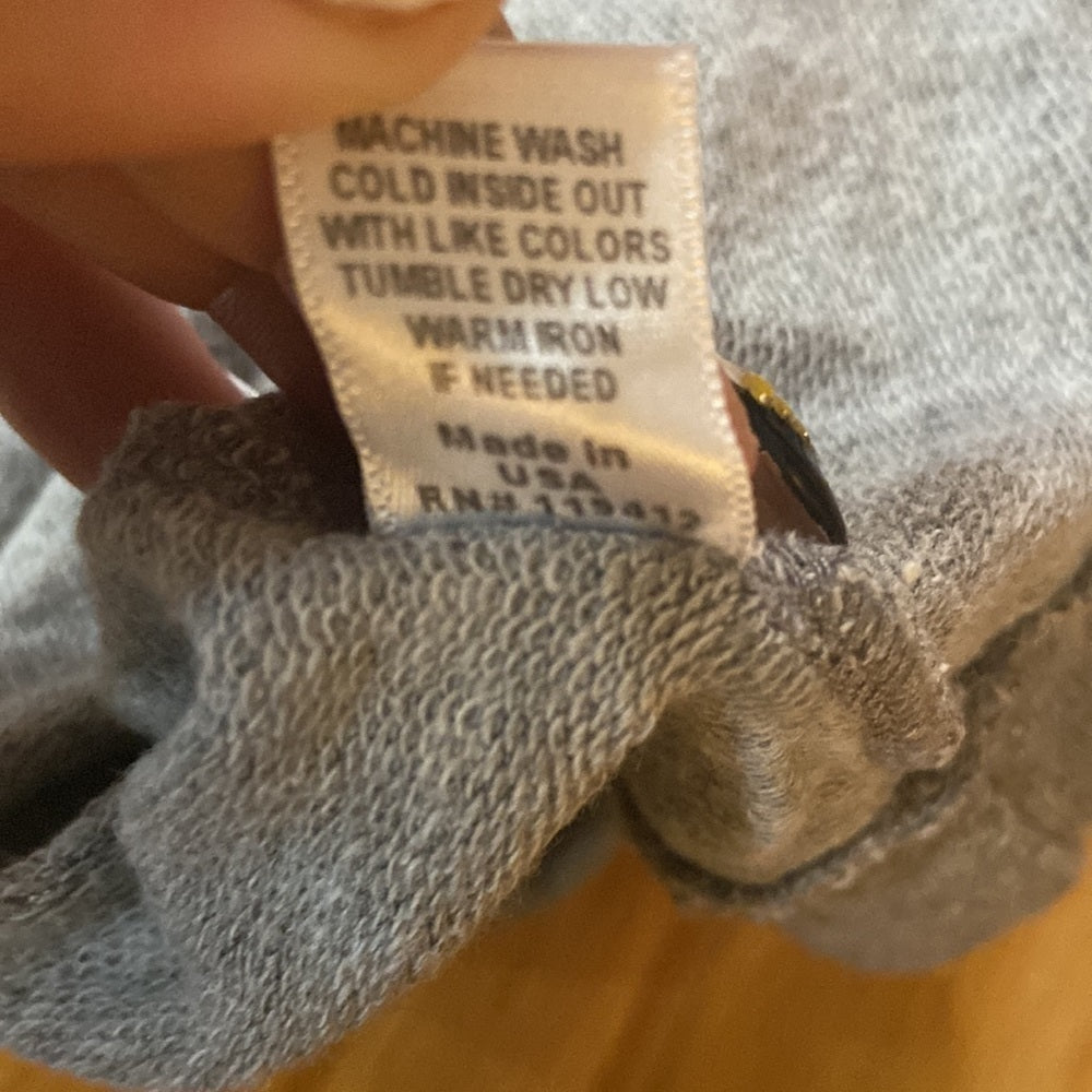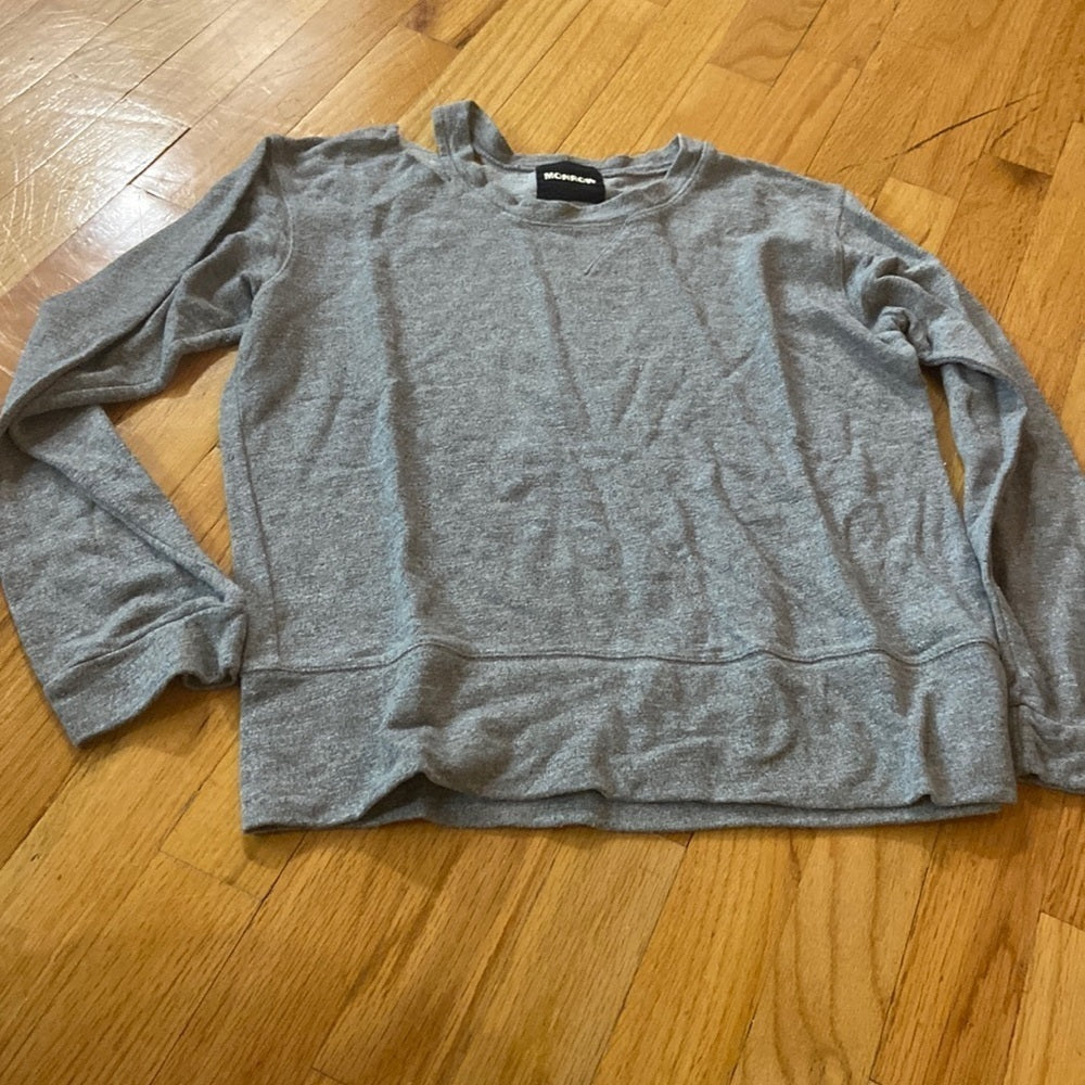 Grey long sleeved top with distressed tear at the collar.