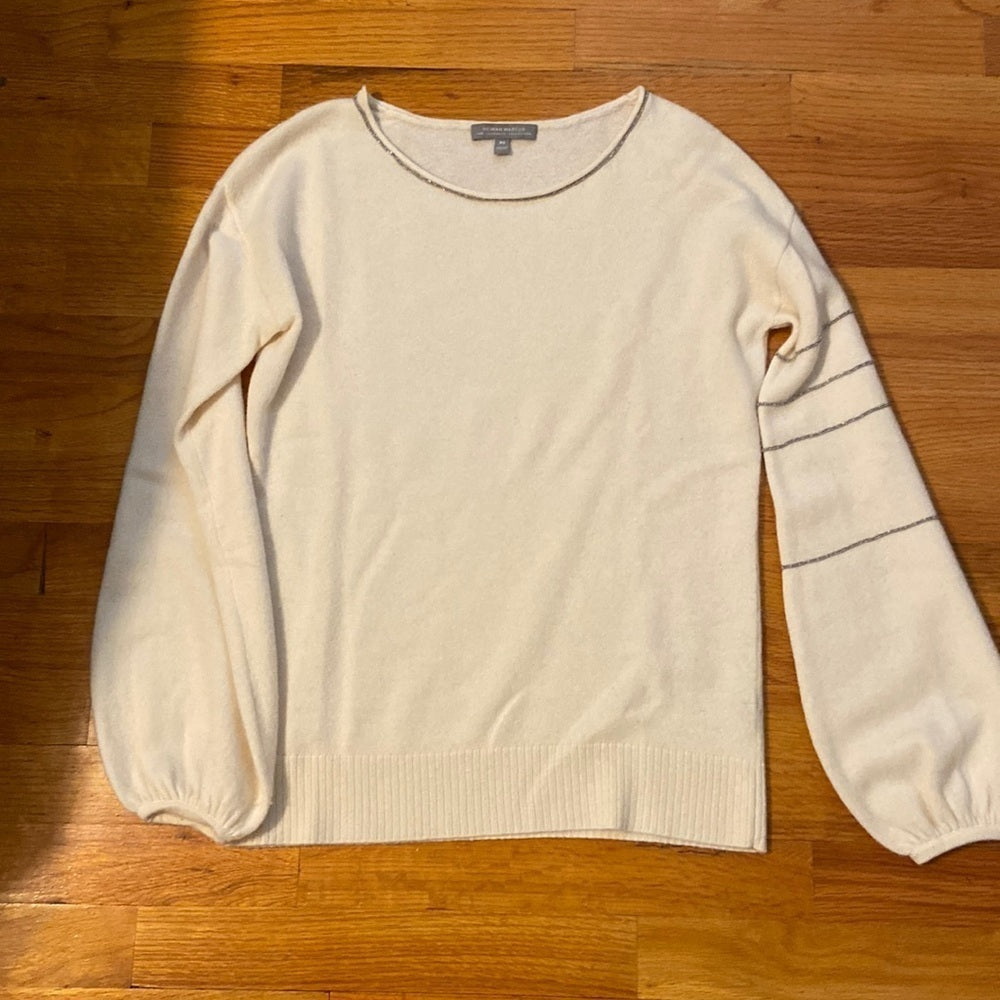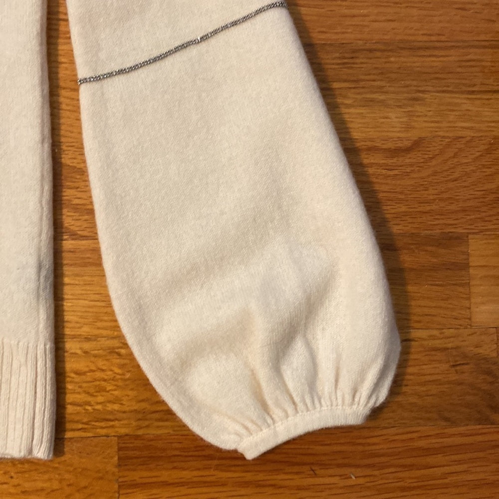 Cream 100% cashmere sweater. Jeweled neckline design and around one sleeve.