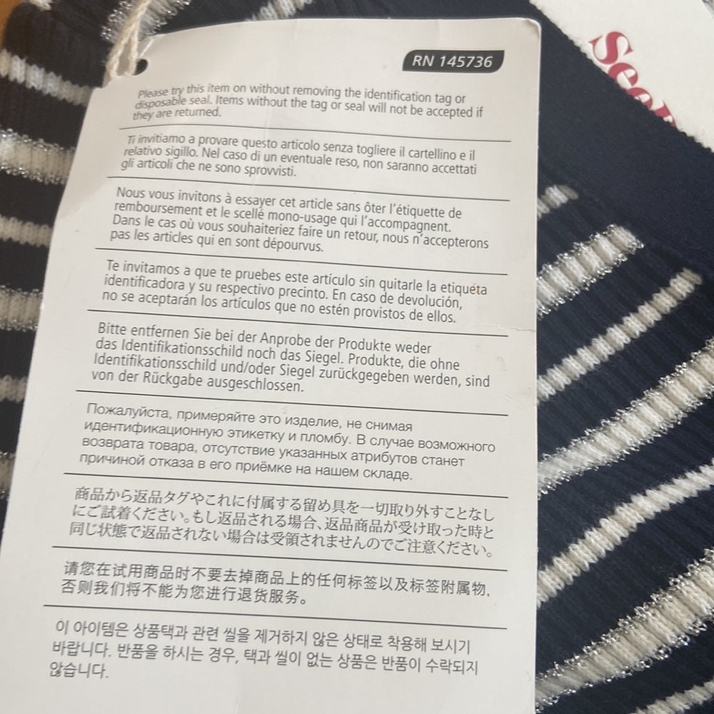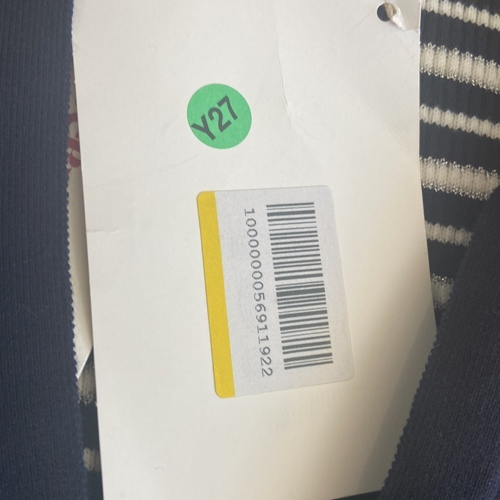 Blue and white striped cardigan with silver accent. White ruffle with blue edge on bottom.