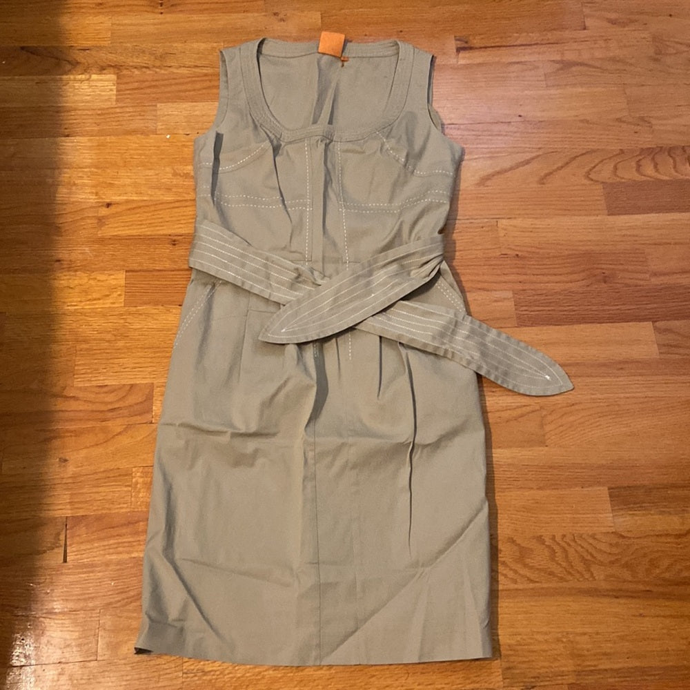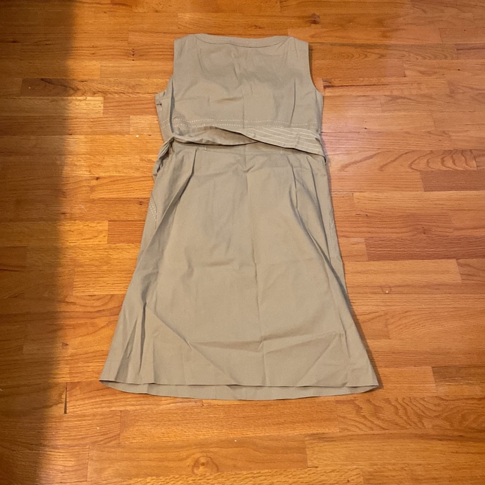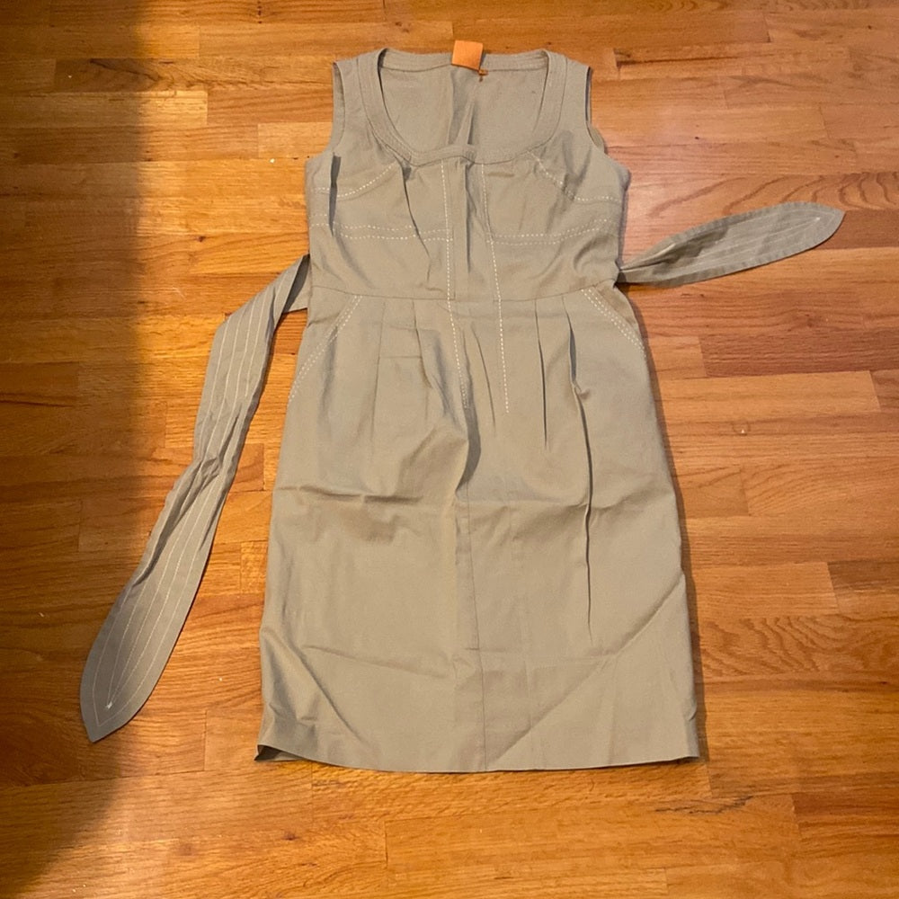 Tan sleeveless dress with cream stitching design. Fabric belt removeable. Side zipper closure.